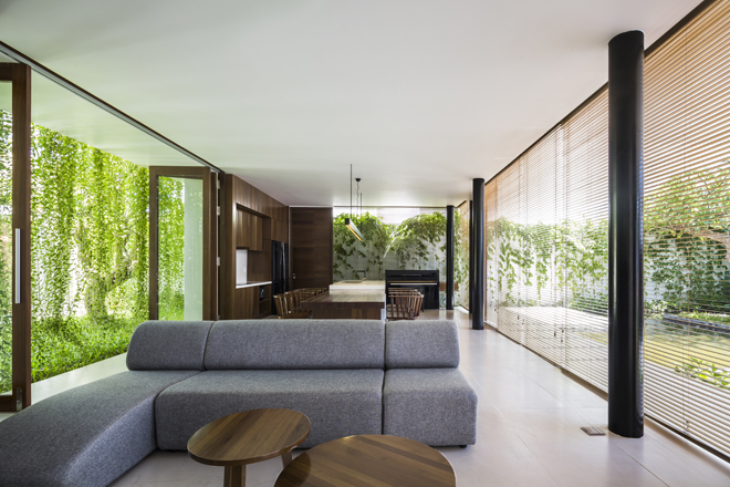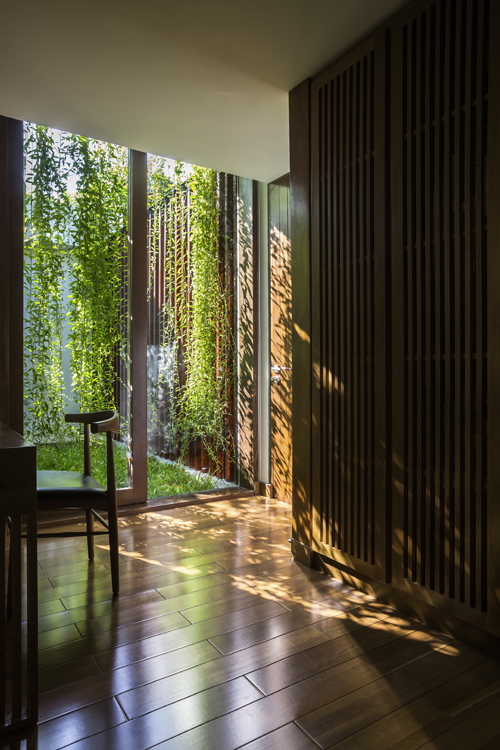 Một hành lang dài xuyên suốt cả ngôi nhà, đi qua các căn phòng và ô sân vườn tự nhiên.